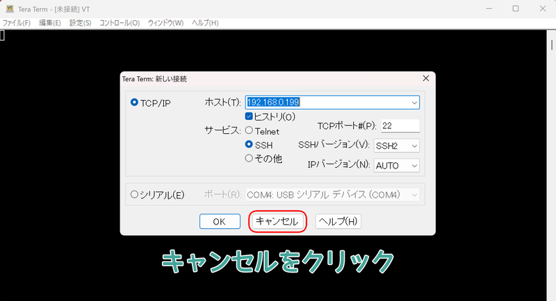 まずは、Tera Termを開いたら一度接続をキャンセルしてくれ。