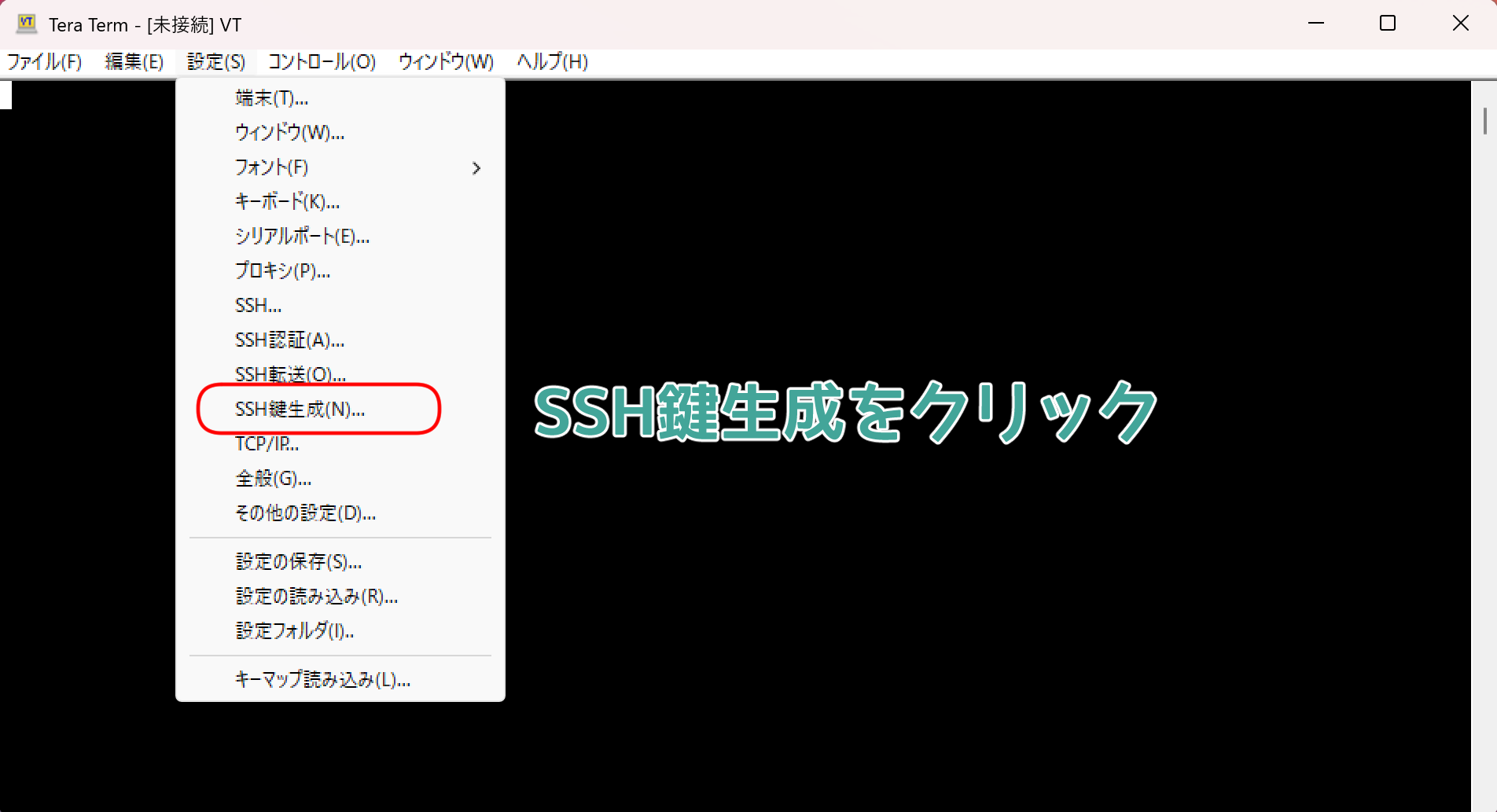 メニューバーの設定からSSH鍵生成をクリックして…