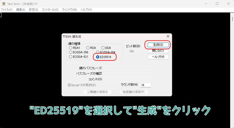 鍵の種類は"ED25519"を選択して生成をクリックする。