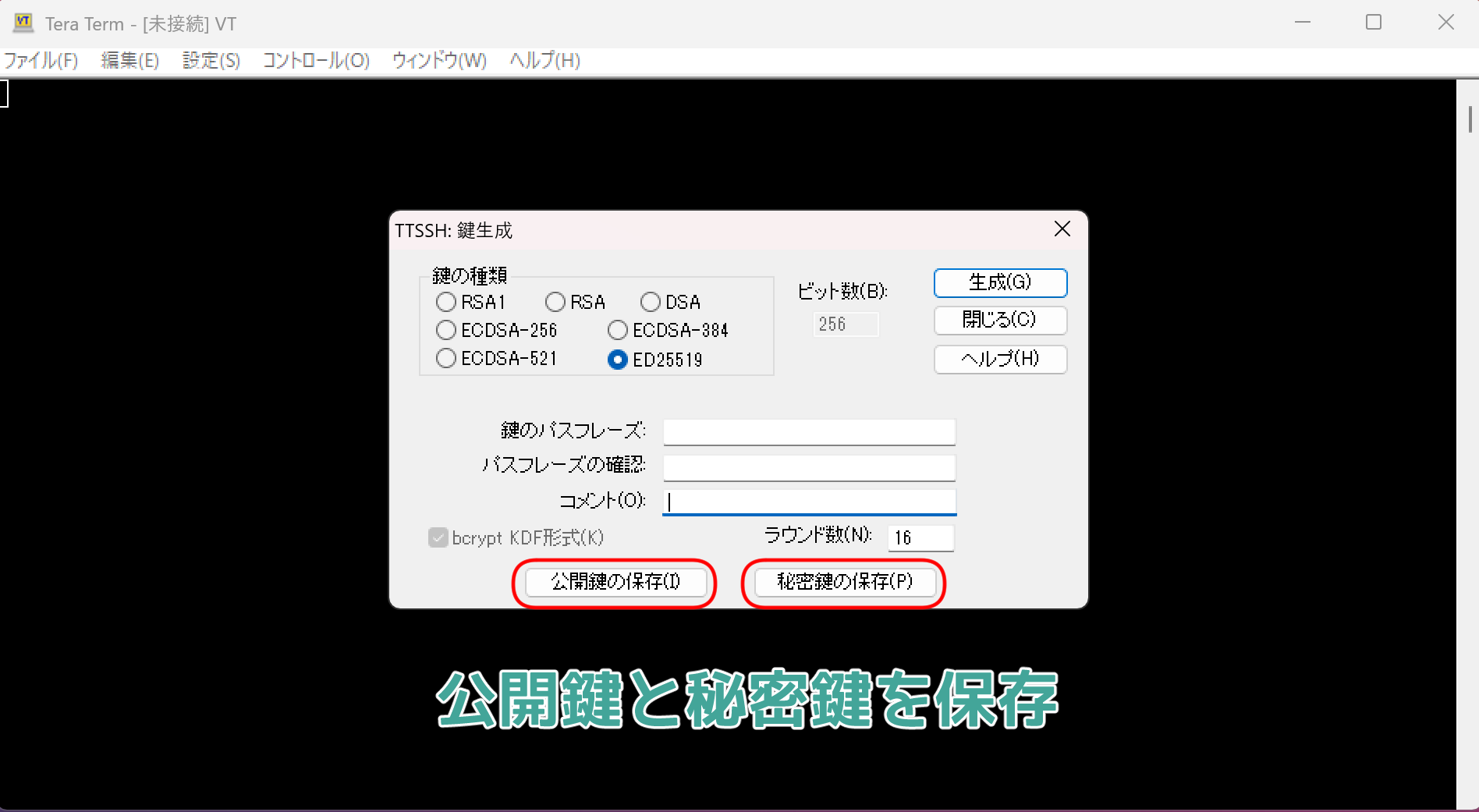 公開鍵と秘密鍵を保存したら一度、Tera Termを閉じる。