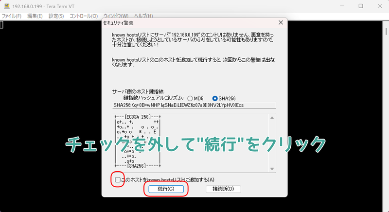 ログインの時に注意してほしいのが、“このホストをknown hostsリストに保存する(A)“のチェックを外して"続行"をクリックしてほしい。