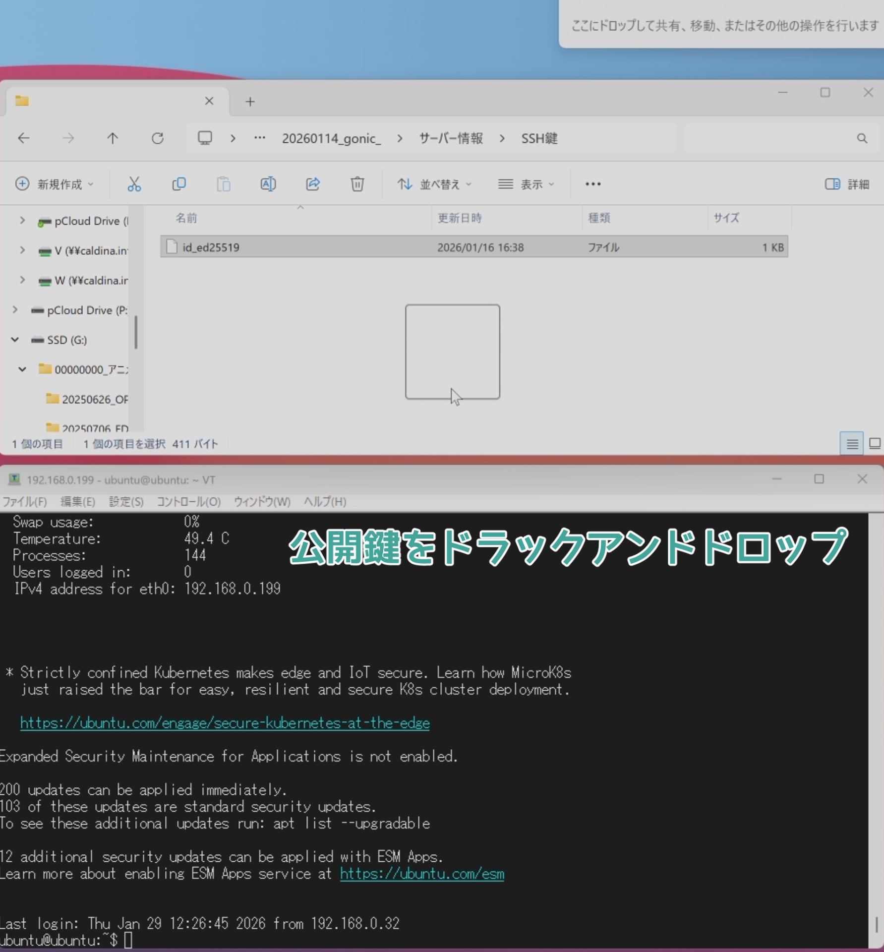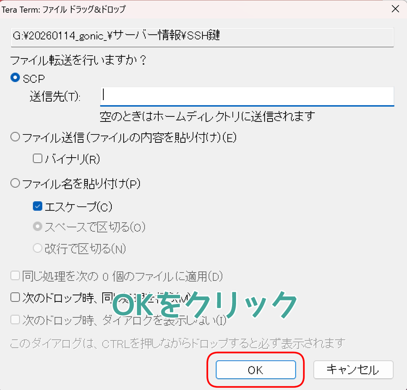 サーバーへログイン出来たら、先ほど保存した公開鍵をTera Termへドラックアンドドロップする。