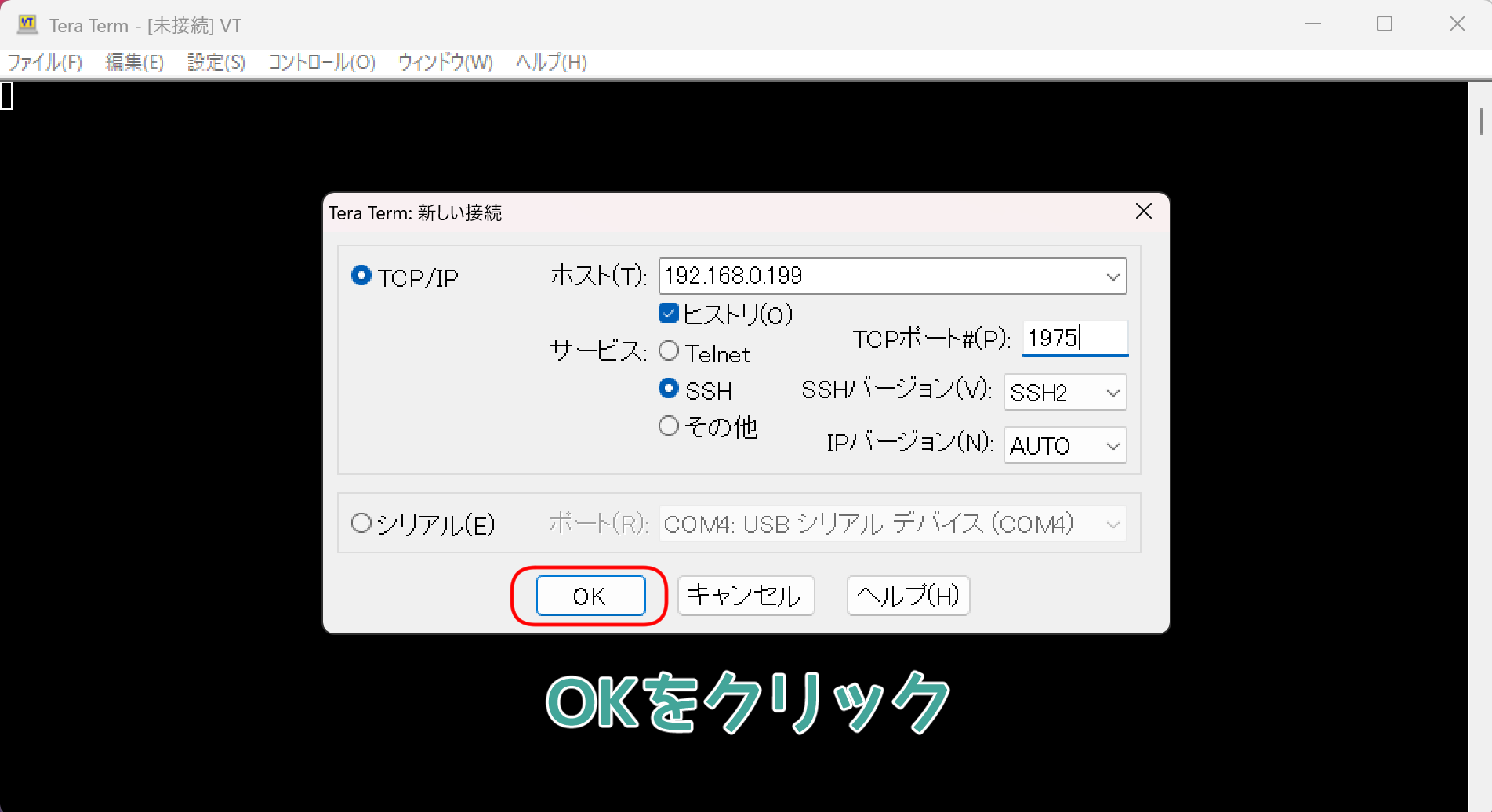 再度Tera Termを開いたら、“OK"をクリックしてログインしてくれ。