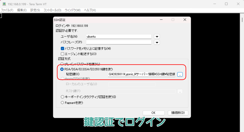 今度は、パスワードではなく保存した秘密鍵を選択してログインしてみてほしい。